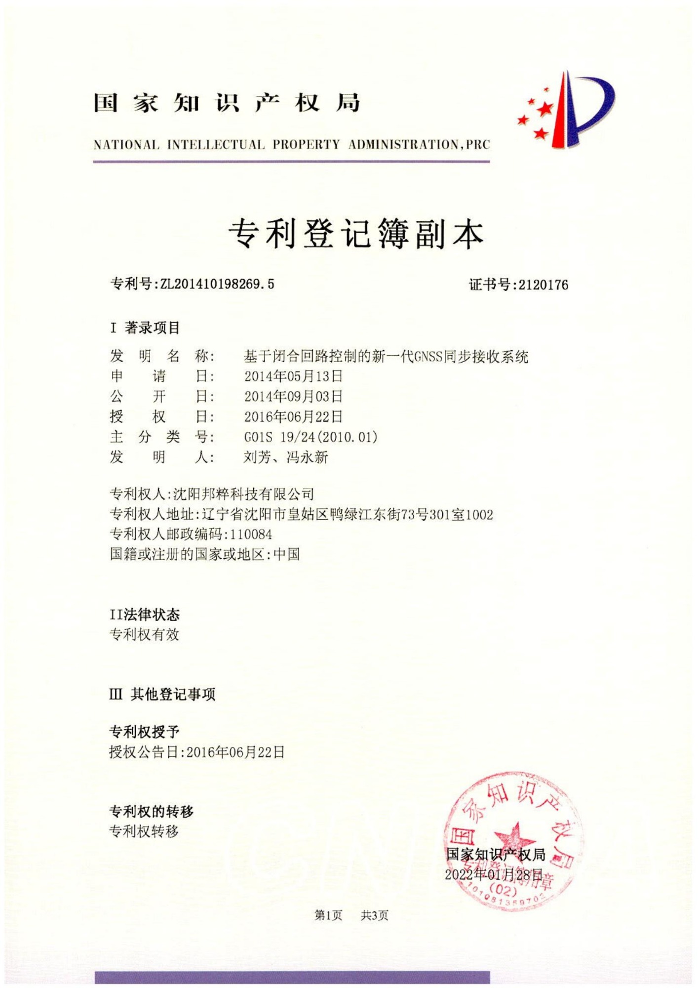 基于閉合回路控制的新一代GNSS同步接受系統(tǒng)專利證書