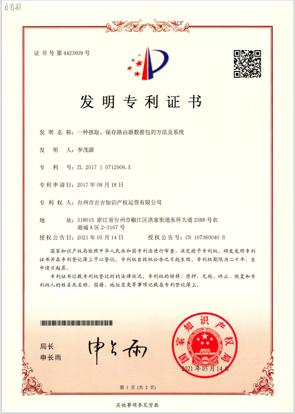 一種抓取、保存路由器數(shù)據(jù)包的方法及系統(tǒng)專利證書