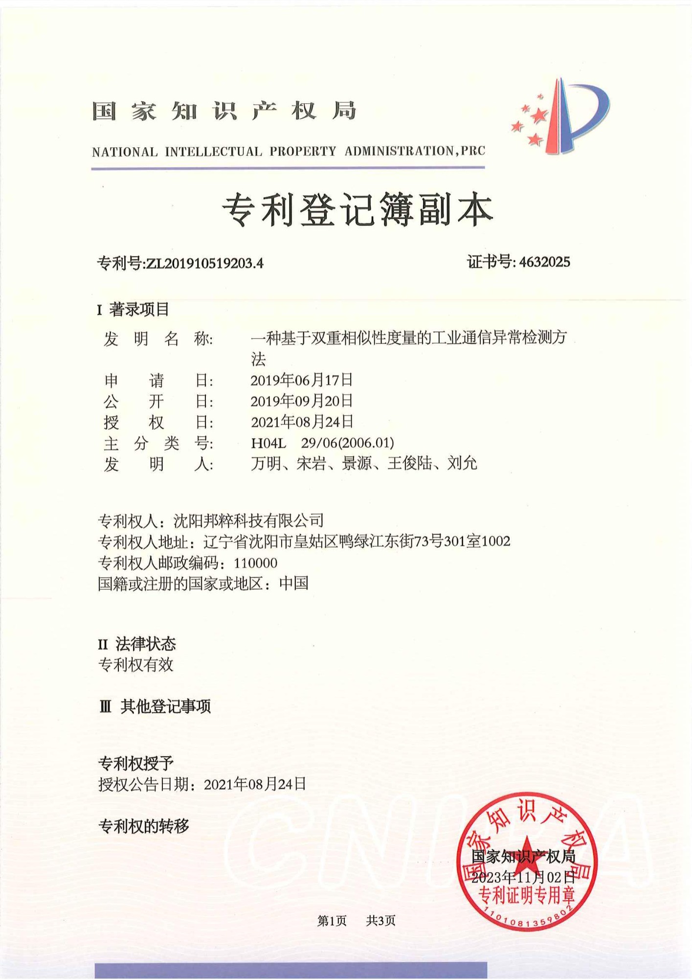13.一種基于雙重相似性度量的工業(yè)通信異常檢測方法專利證書