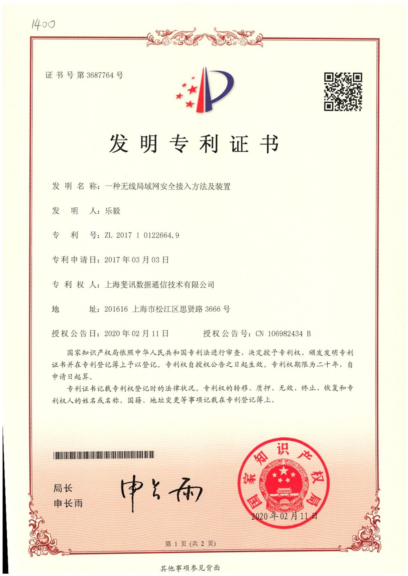 一種無線局域網(wǎng)安全接入方法及裝置專利證書